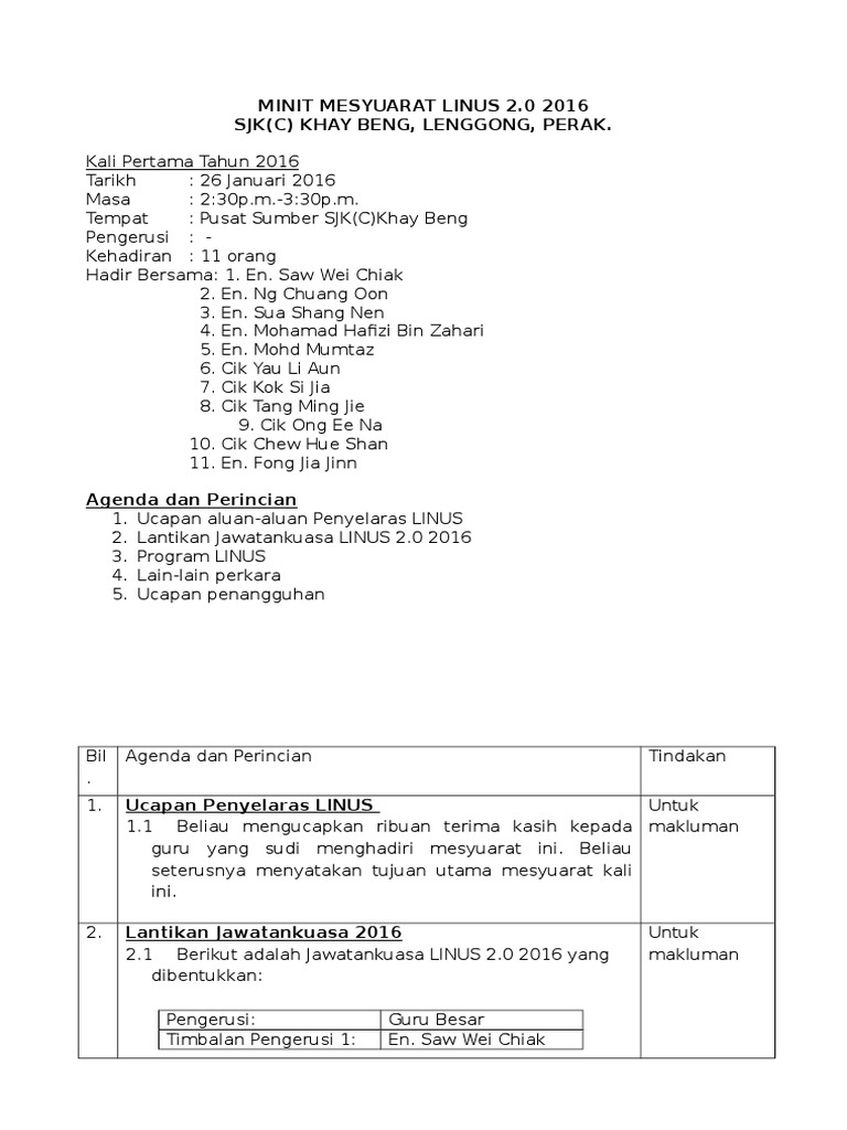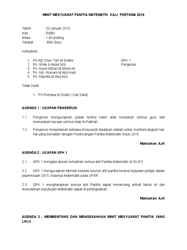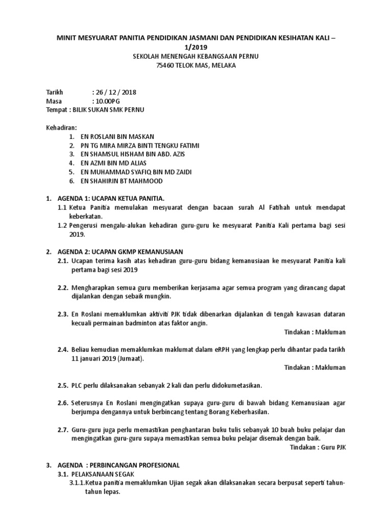 Adakah ini kali pertama anda ditugaskan untuk mencatat minit mesyuarat? Jika ya, anda perlu faham bahawa ia adalah tugas yang amat penting. Bob sirajul mohd zuki rohaiza marzuki ucapan pengerusi i. Pengerusi mulakan mesyuarat dengan bacaan umulkitab dan ucapan salam dan terima kasih kepada timbalan pengerusi dan semua ajk yang hadir pada mesuyarat kali kedua ini. Minit mesyuarat kali pertama 3k 2017. Pengesahan minit mesyuarat lepas 2.1. 24 disember 2013 masa : Perkara berbangkit3.1 menu yang tidak mendapat sambutan akan ditukar untuk tahun hadapan.3.2 penyediaan makanan perlu mematuhi menu yang telah dipersetujui pada awal tahun. Pn ku zakiah bt ku. Ajk surau assyakirin kali 2/2014. Minit mesyuarat kokurikulum bil 1/2019. So please help us by uploading 1 new document or like us to download Use the download button below or simple online reader.