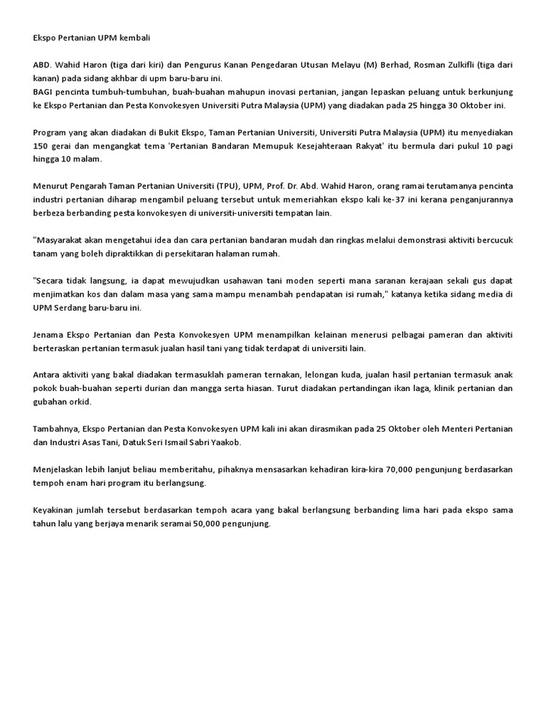 Ekspo Pertanian Upm Kembali from imgv2-1-f.scribdassets.com Majlis perasmian program mega penanaman pokok 2019 upm. About universiti putra malaysia (upm) university putra malaysia is a public research university located at serdang, close to the capital city of kuala lumpur. Contact details of fakulti pertanian | universiti pertanian malaysia. Universiti putra malaysia (upm) formerly known as universiti pertanian malaysia was founded in 1971 through the merger of faculty of agriculture, university malaya and agriculture college in serdang. Ia berfungsi sebagai tempat penyelidikan dan kemudahan bagi para pelajar upm. University putra malaysia ( upm ; Kemarin tanggal 28 agustus 2017 fakultas pertanian telah dilakukan audit mutu internal yang dilakukan oleh tim aditor lpm ulm yang lambung mangkurat mengadakan acara lokakarya pemuktahiran kurikulum. Upm ( universiti putra malaysia ) beryls choclate factory serdang hospital ioi city mall putrajaya district 21 putrajaya icescape ice rink putrajaya wetlands putrajaya cyberjaya malaysian chinese museum the mines mall mines cruise national aquatic center bukit ekspo taman pertanian.