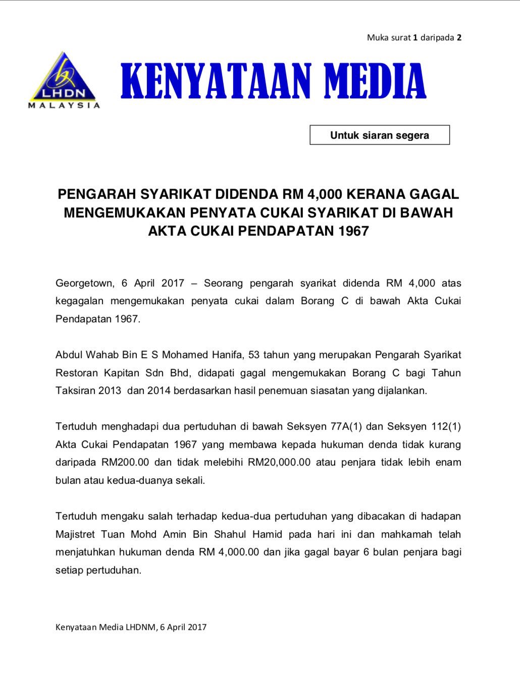 Ia dikuatkuasakan di bawah akta cukai pendapatan 1967.